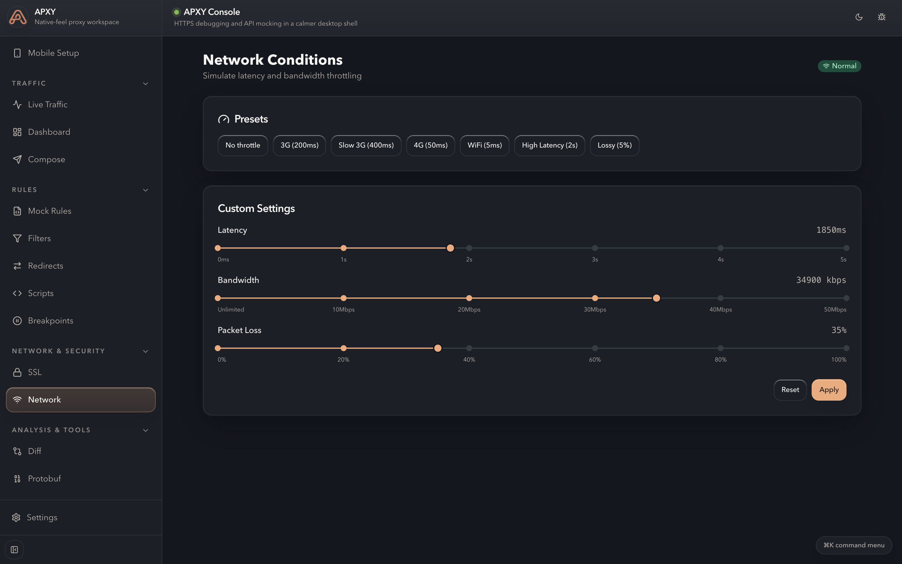 Throttle latency, bandwidth, and packet loss to reproduce bad-network behavior before users hit it.
